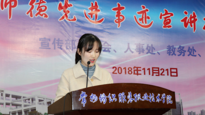 报告会上,四位教师代表依次登台作精彩宣讲。经贸学院刘峻辰老师以《用心呵护,关心关爱学生健康成长》为题,首先宣讲了常州市师德模范陈璐老师的先进事迹;随后,人文学院仝玉老师、纺织学院杨静芳老师、经贸学院薛卓之老师,分别以《经师易得,人师难求》、《把平凡的事情做好就是不平凡》、《立足本职、教书育人、爱生如子、敬业奉献》,先后宣讲了陈学凤、邵东峰、张茹三位老师的感人事迹。