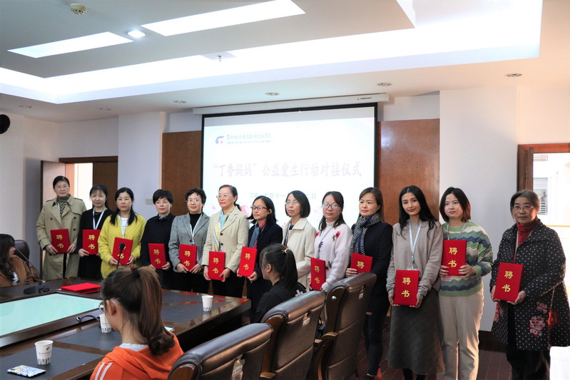 仪式上校妇联、校工会曹为成主席介绍了“丁香妈妈”爱生行动项目方案并宣布了18对结对名单。接着赵玲珍副院长为18位“丁香妈妈”颁发了结对聘书。随后18位美丽的“丁香妈妈”为同学们赠送了精心挑选的荐读励志图书和暖心卫衣。