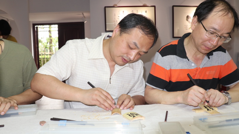 20日上午,培训班组织学员赴常州西太湖徐氏竹木刻博物馆参观。徐氏竹木刻博物馆是常州市第一家省级民办竹木刻博物馆,馆长徐枫是我校创意学院教师,是国家级非遗常州留青竹刻第三代主要传承人;近年来,他先后获评省乡土人才“三带”能手、省轻工“大国工匠”称号;2018年被国际竹藤组织授予“亚太地区竹工艺名匠”称号。学员们走进博物馆,在件件珍藏精品中感受着“非遗”魅力和传统工艺的传承,感受徐枫大师对艺术执着专注、精益求精、不断创新、追求卓越的工匠精神。参观结束后,学员们在徐枫大师的指导下还体验了一回竹刻艺术,制作一枚属于自己的竹刻作品。