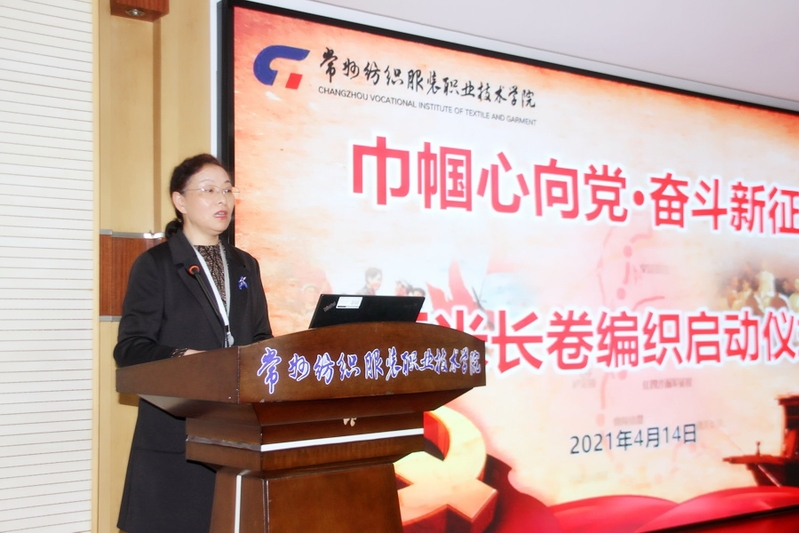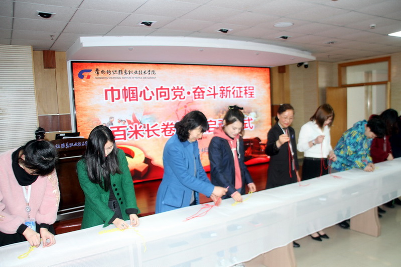 4月14日周三下午16时在1750会议室,校妇联举行了“巾帼心向党·奋斗新征程”百米长卷编织启动仪式。校党委委员、副院长赵玲珍,校企合作单位常州威登纺织有限公司戴兄总经理以及各二级学院教师和学生代表共计70余人参加了此次启动仪式。启动仪式的由妇联主席曹为成主持。