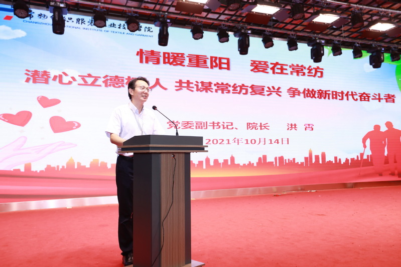 活动现场,洪霄首先以《潜心立德树人 共谋常纺复兴 争做新时代奋进者》为题向老同志通报了学校一年来的重大发展情况,他提到这一年来,全体教职工同心抗疫,共筑防线,做到了疫情防控常态化和学校发展两手抓、两手硬、两不误、两促进,并取得显著成绩。所有这些成绩的取得都离不开全体老同志的热情关注和大力支持,几十年来学校的建设与发展,凝聚了老一辈的心血和汗水,老同志们不畏艰难、敢于挑战的创业勇气,任劳任怨、精益求精的敬业精神值得每个常纺人永远学习。洪霄希望在学校未来发展的路上,老领导、老教师、老同志多多理解学校,多多宣传学校,多到学校走走,为学校发展献计献策,给学校的工作多提宝贵意见,再创常纺新的辉煌。最后,洪霄代表全体师生祝离退休老同志重阳节快乐,生活幸福,身体健康!