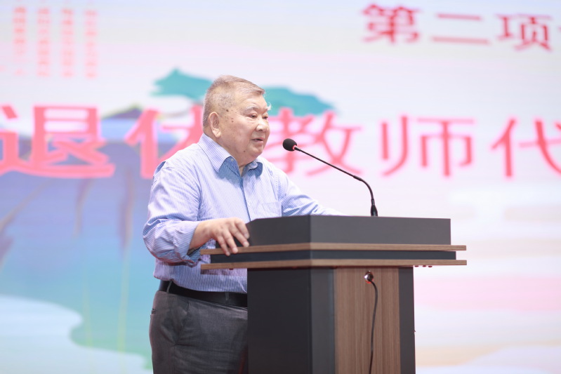 接着,退休教师代表、老校长金小坡发言。他首先对学校对离退休教师的关心衷心感谢,表示老同志对学校一年来取得的成就感到欣慰,同时也呼吁在座的各位离退休教师充分发挥余热,为学校的高质量发展发一份光,出一份力,最后,还分享了部分教师其乐融融,快乐幸福的退休生活。