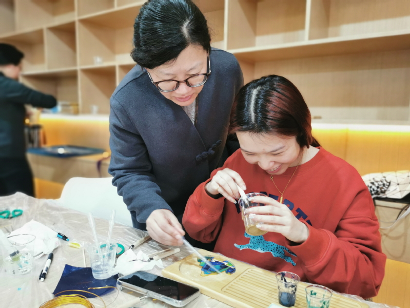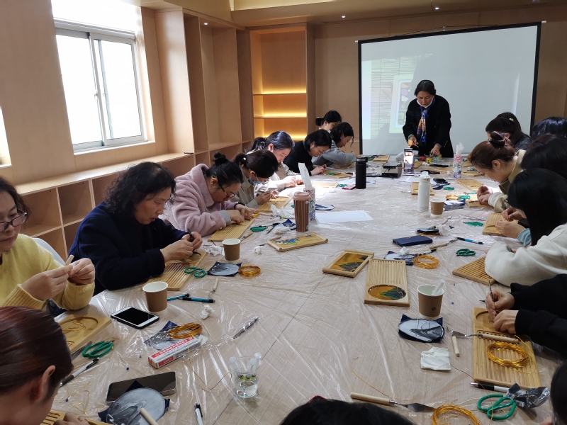 为本次活动圆满完成,校工会组织了创意学院时尚礼品工作室许晓婷、徐静、许婷芳三位老师进行艺术指导共同完成。中国绿象征着生命、希望、活力和安全感,是中国人生命的底色,许晓婷从工具介绍、掐丝技巧、点蓝方法入手,带领大家走进《千里江山图》,徐静和许婷芳为大家做具体示范展示,带领大家体验感受掐丝珐琅的魅力,在三位老师手把手地辅导下,第一次体验掐丝珐琅活动的会员们每人都完成了一幅精美的作品,在欢声笑语中过了一个体验美、感受美、创造美的节日活动。