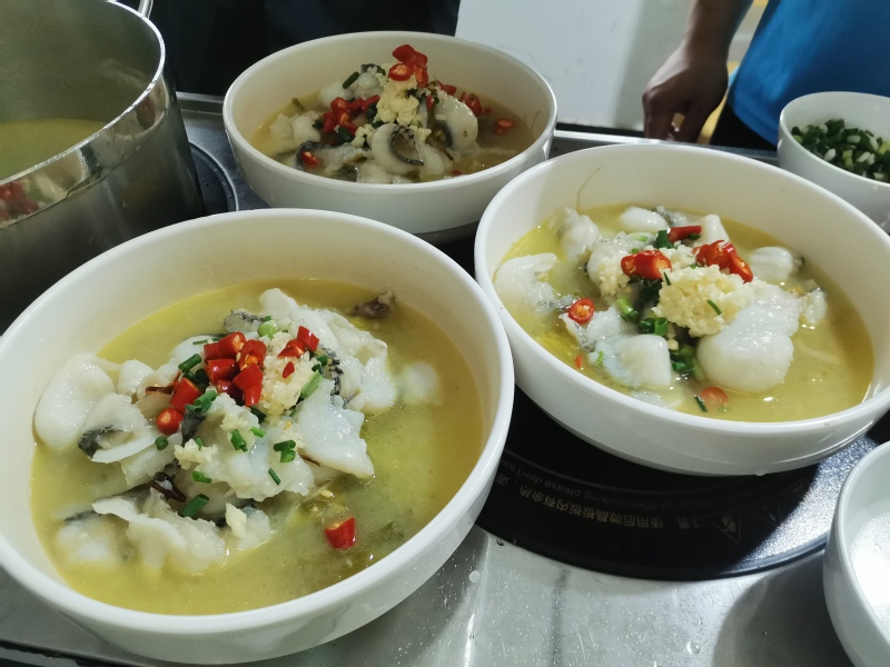 培训中,张志青讲解了酸菜鱼的发展历程以及黑鱼、酸菜、豆芽等各种配料的准备、挑选技巧,学海餐厅厨师王家宇进行“喝汤酸菜鱼”的现场制作演示,参培的会员认真听讲的同时交流了自己在制作过程中遇到的疑问,现场忙中有序,很快,一份份酸爽鲜香的“喝汤酸菜鱼“就呈现在大家面前,老师们品尝后,赞不绝口,并希望今后多举办此类活动。