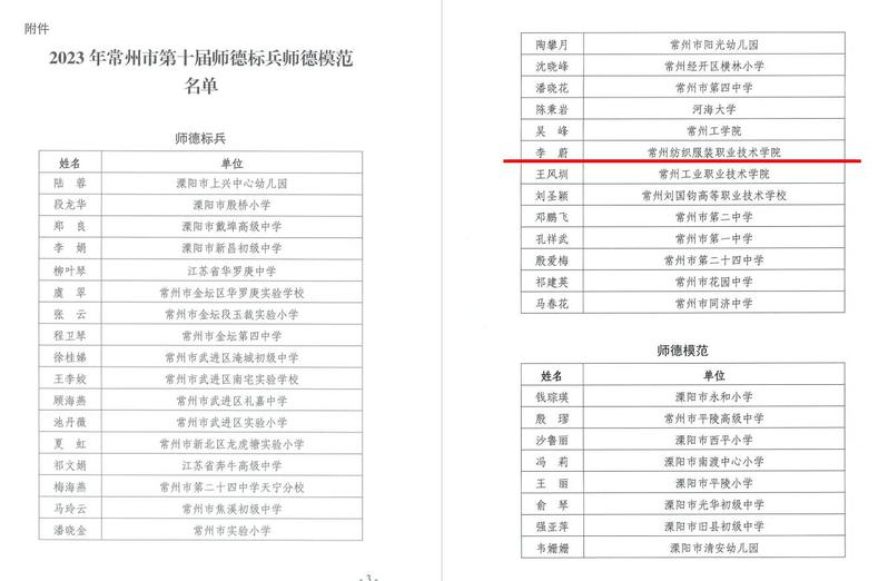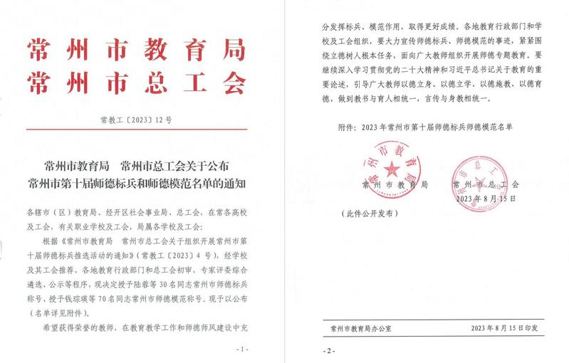 日前,常州市教育局、常州市总工会发布了《关于公布常州市第十届师德标兵和师德模范名单的通知》(常教工〔2023〕12号),我校李蔚老师被授予常州市第十届师德标兵称号。