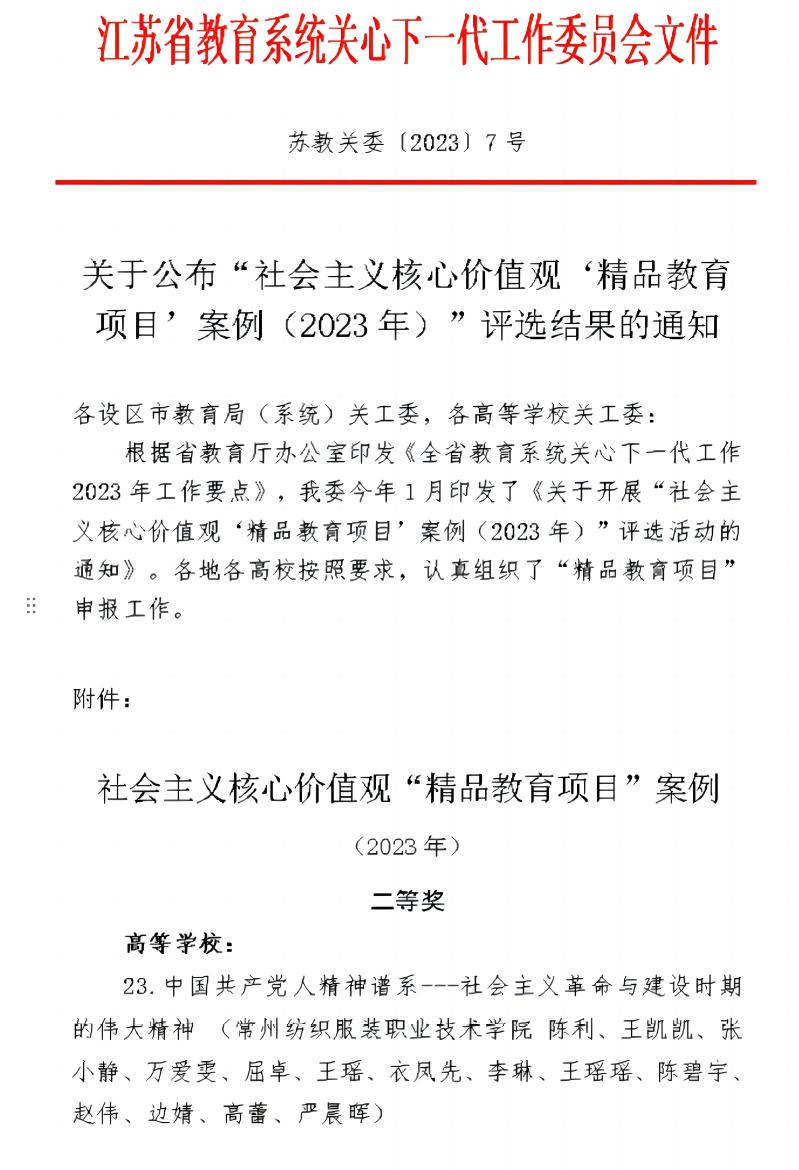 近日,江苏省教育系统关工委印发《关于公布“社会主义核心价值观‘精品教育项目’案例(2023年)”评选结果的通知》(苏教关委〔2023〕7号)文件,我校关工委推荐的《中国共产党人精神谱系---社会主义革命与建设时期的伟大精神宣讲》案例获二等奖。该案例由关工委联合马克思主义学院制作完成,重点宣讲伟大建党精神及社会主义革命和建设时期的伟大精神。一百多年来,中国共产党弘扬伟大建党精神,在长期奋斗中构建起中国共产党人的精神谱系,锤炼出鲜明的政治品格,历史川流不息,精神代代相传。