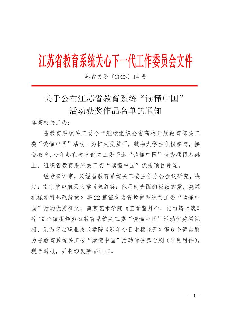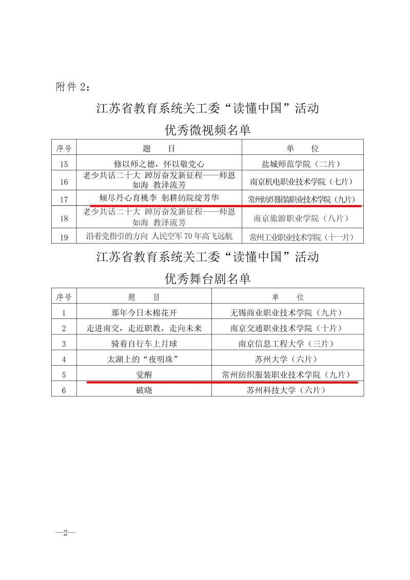 近日,江苏省教育系统关工委下发了《关于公布江苏省教育系统“读懂中国”活动获奖作品名单的通知》苏教关委〔2023〕14号,我校报送的服装学院关工委制作的《倾尽丹心育桃李 躬耕纺院绽芳华》获得微视频优秀奖(全省共19个)、经贸学院关工委排演的舞台剧《觉醒》获得舞台剧优秀奖(全省共6个)。