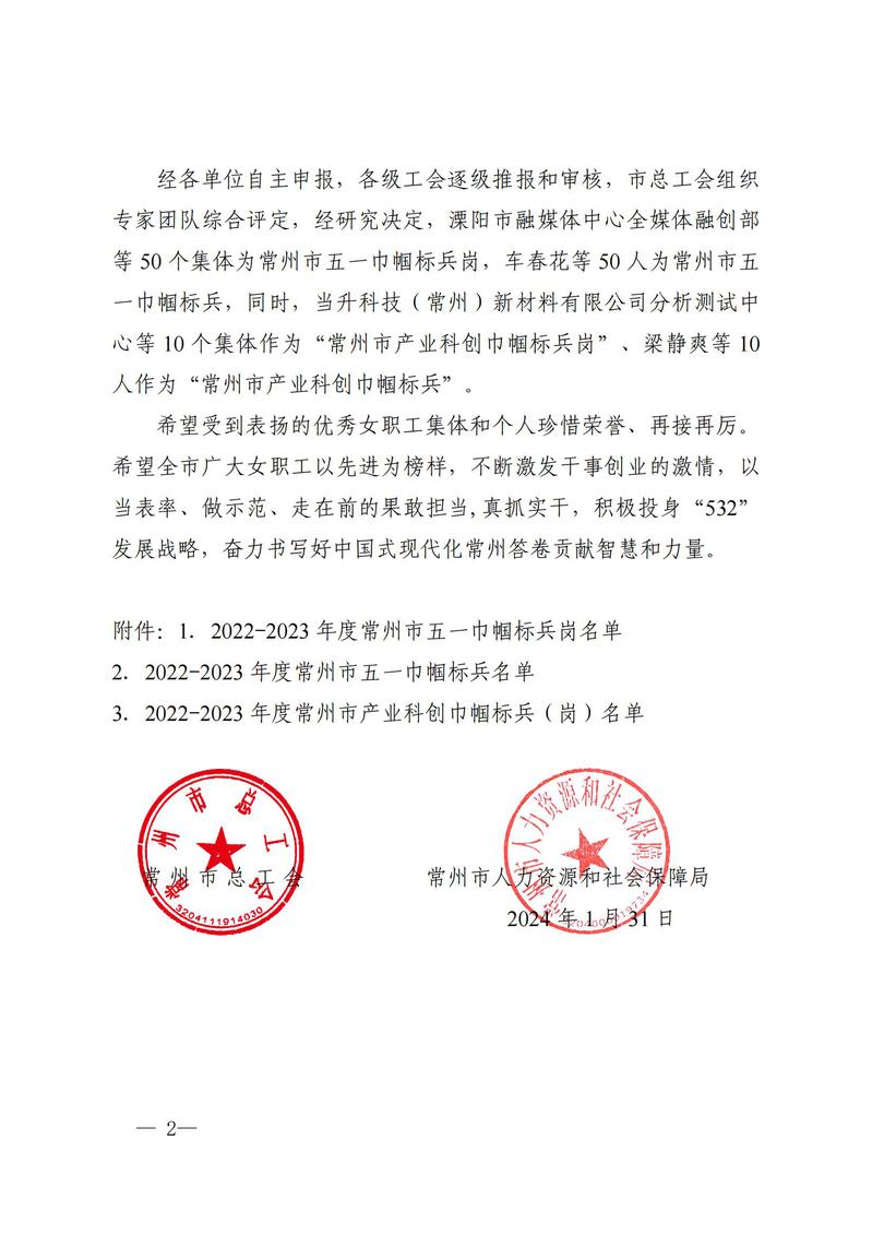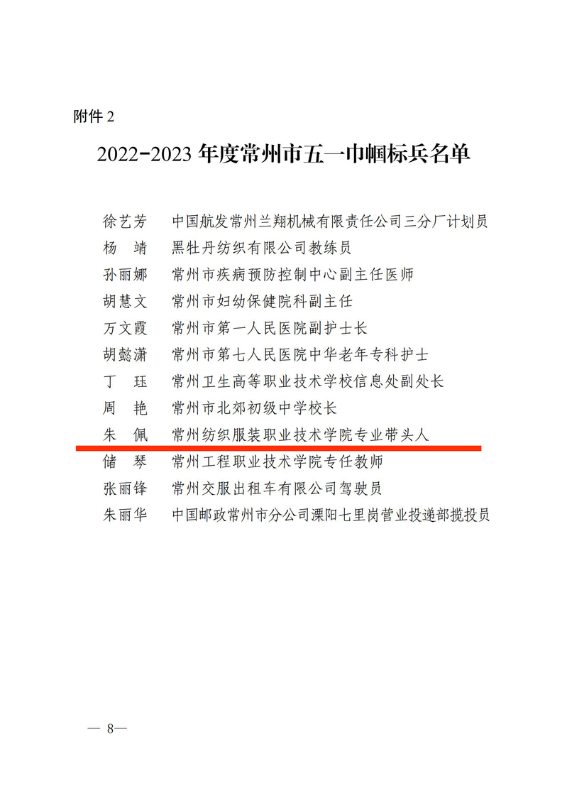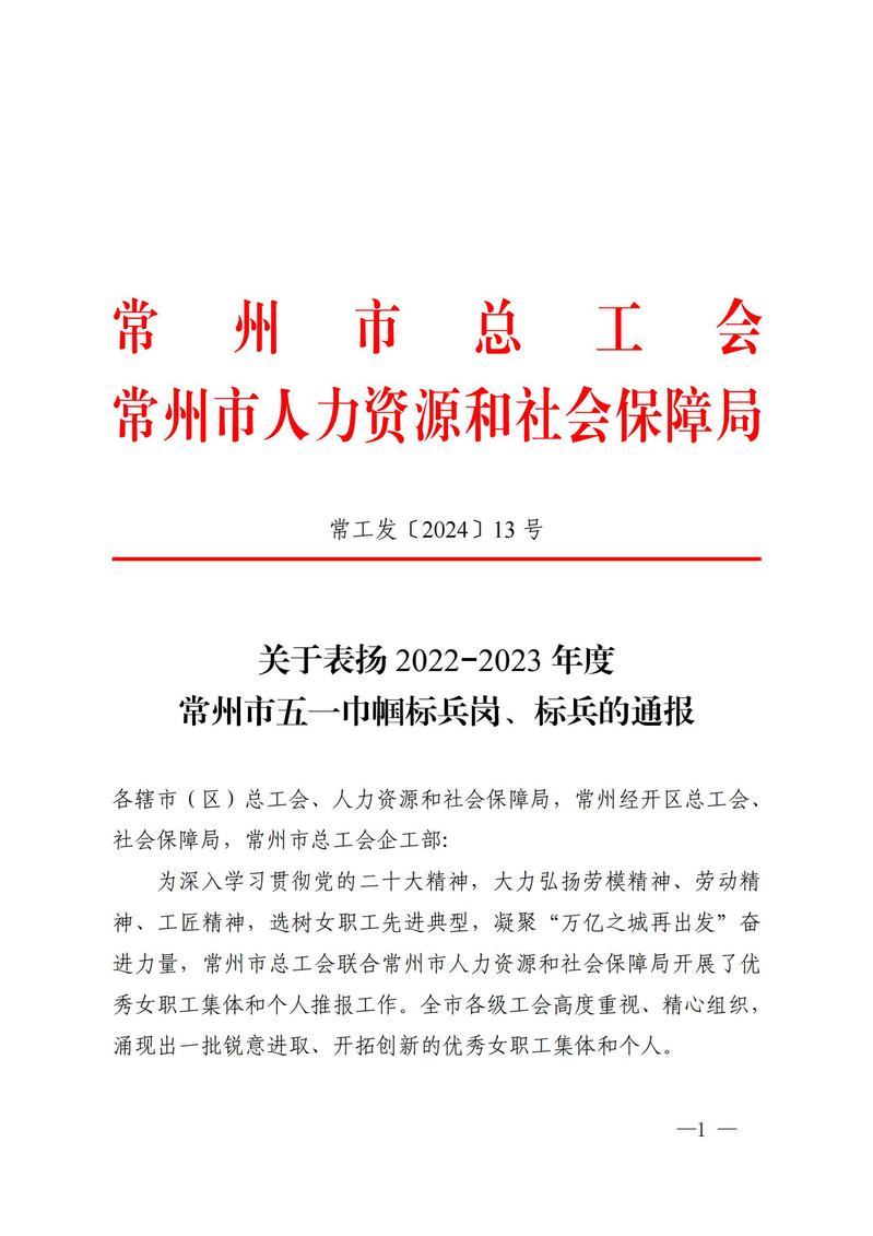 日前,常州市总工会、常州市人力资源和社会保障局发布了《关于表扬2022-2023年度常州市五一巾帼标兵岗、标兵的通报》(常工发〔2024〕13号),我校朱佩老师获得了常州市五一巾帼标兵的称号。