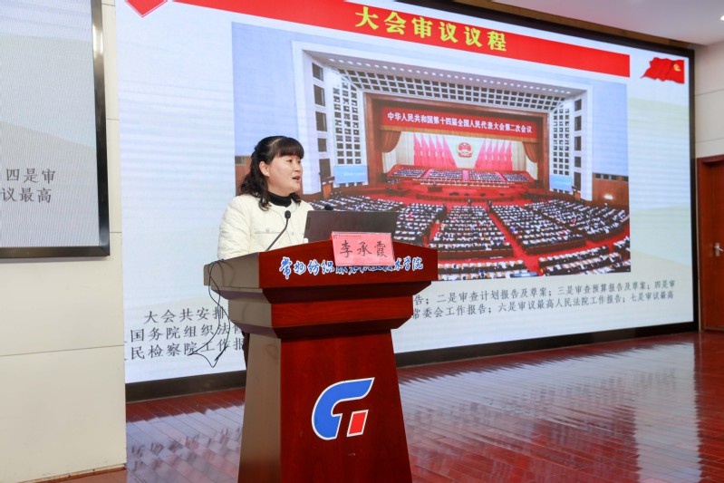 李承霞从大会概况、习近平总书记参加各代表团情况、政府工作报告及审议情况、全国人大常委会工作报告、关于国务院组织法修改情况等八个方面向大家传达十四届全国人大二次会议精神。
