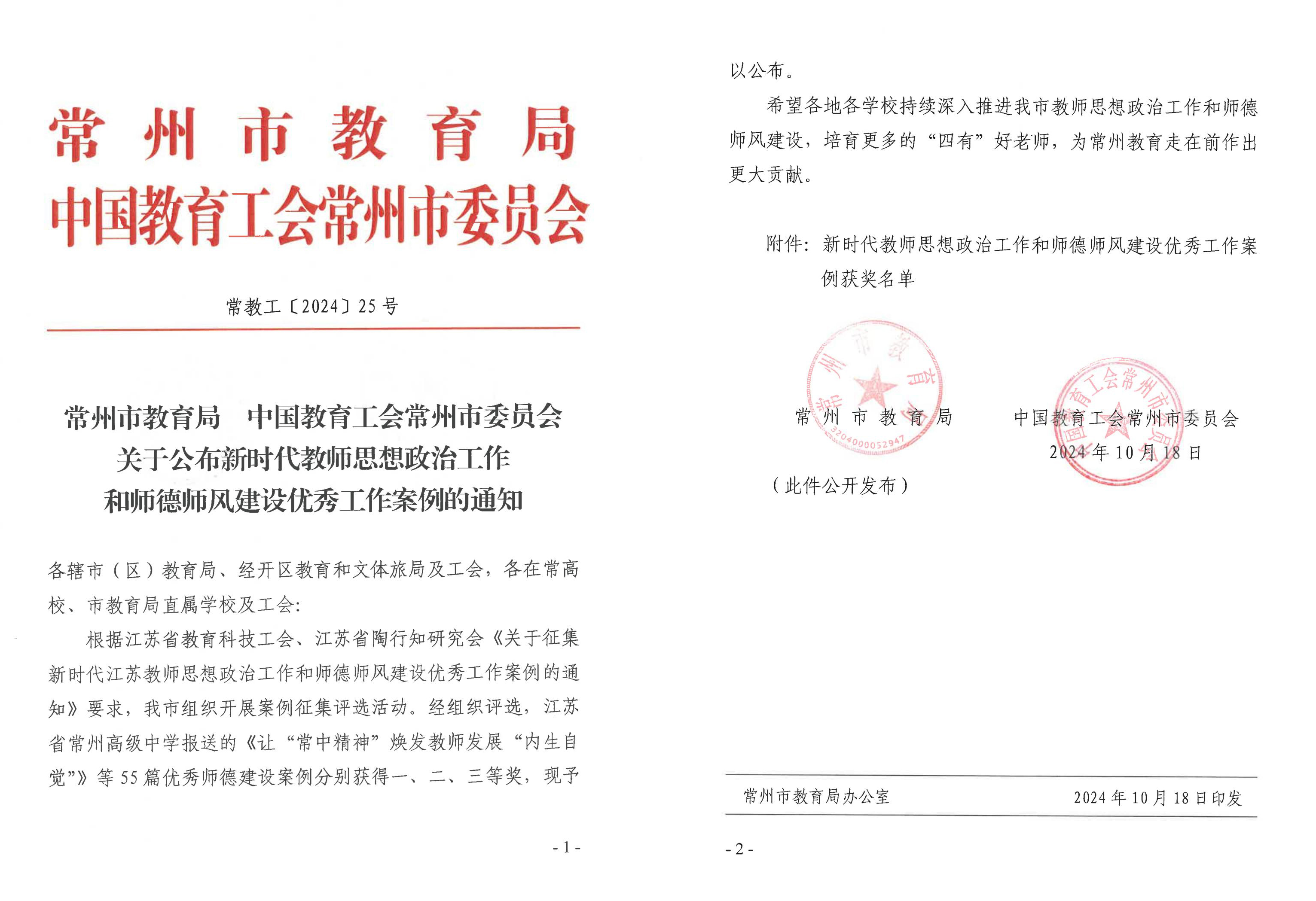 近日,从《常州市教育局 中国教育工会常州市委员会关于公布新时代教师思想政治工作和师德师风建设优秀工作案例的通知》中获悉,我校工会和党委教师工作部联合选送的《党建引领 建强“五链” 推进师德师风建设》工作案例荣获一等奖。