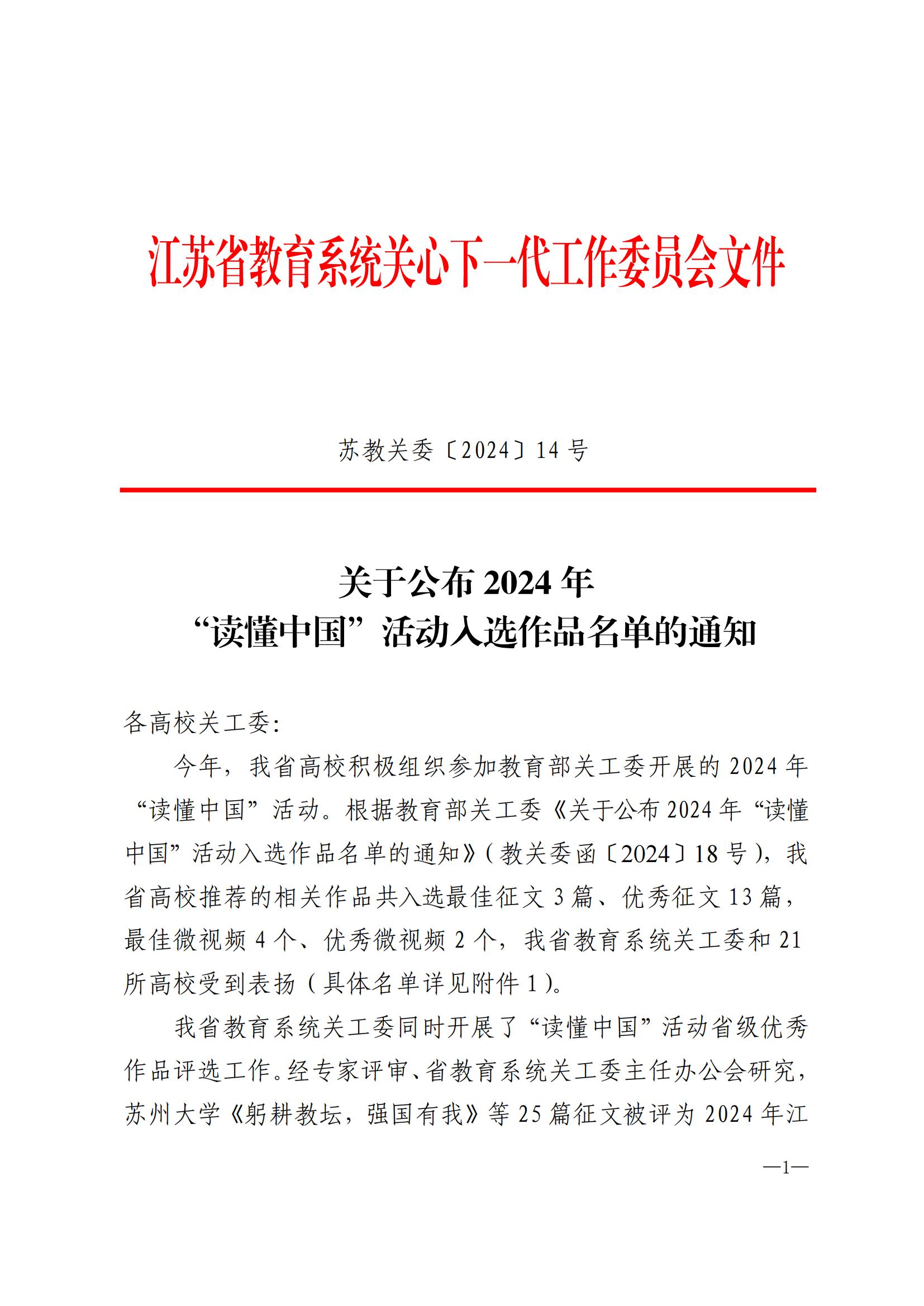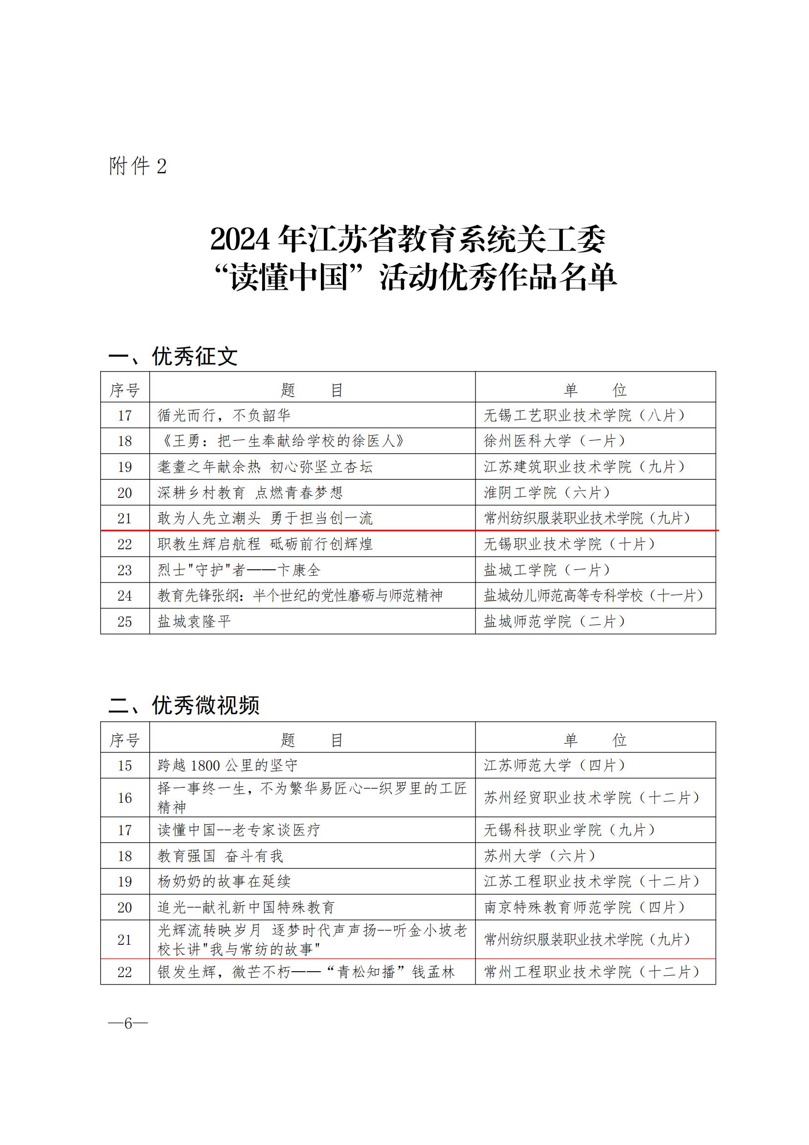 近日,江苏省教育教育系统关工委下发了《关于公布2024年“读懂中国”活动入选作品名单的通知》苏教关委〔2024〕14号,我校选送的服装学院关工委制作的微视频《光辉流转映岁月 逐梦时代声声扬--听金小坡老校长讲“我与常纺的故事”》获得微视频优秀奖(共25个),征文《敢为人先立潮头 勇于担当创一流》获得征文优秀奖(共22个)。