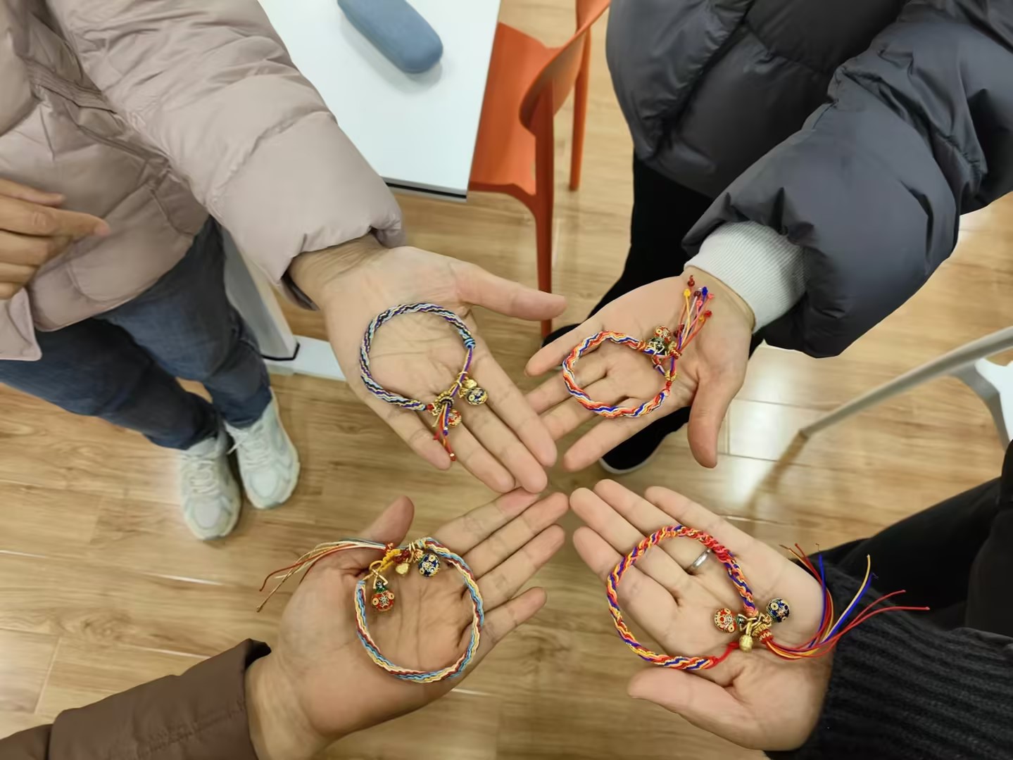 中国绳结艺术如民间文化的“活化石”,承袭自新石器时期祖先结绳记事的传统,由实用的绳结走向审美的艺术,被人们赋予各种吉祥的寓意。活动中,杨静芳为大家介绍了中国结的发展历史,并演示了“轮回手绳”的编织方法。随后由经纬编织社社长李春月等四位学生“小老师”指导编织。绳线在老师们指缝间来回穿梭,一件件作品逐步显现。师生间相互探讨着编绳的心得体会,还增进了师生之间沟通和交流,现场充满了欢乐喜悦的氛围。