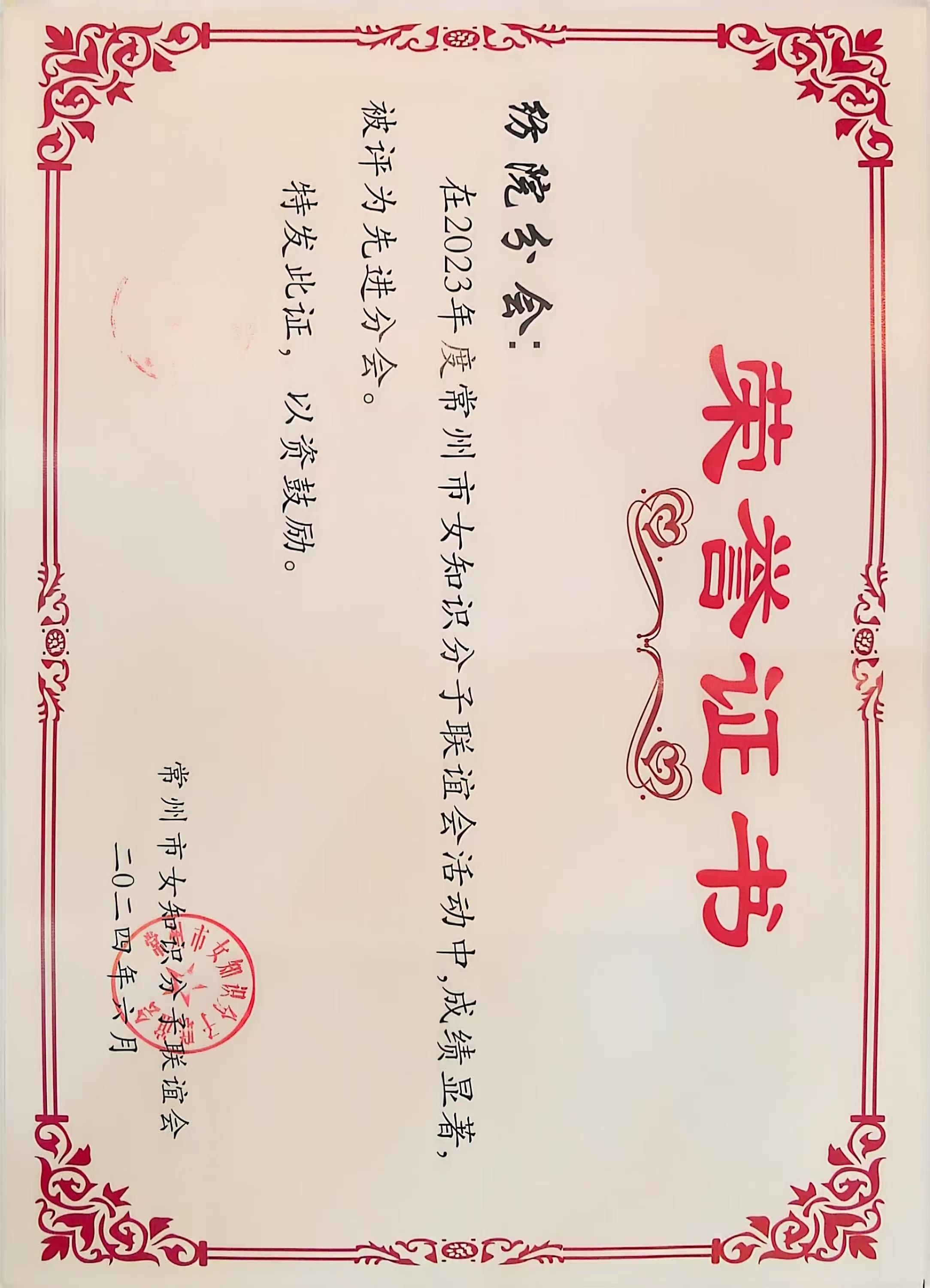 2024年学校女知联组织申报常州市女知联“巾帼建功、科技创新”科技成果奖,获一等奖6项,二等奖8项。9名女知联会员被评为2023年度优秀会员。我校女知联荣获2023年度“先进分会”,这是连续第三年获得该项荣誉。