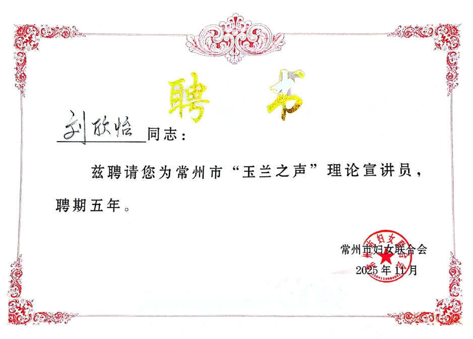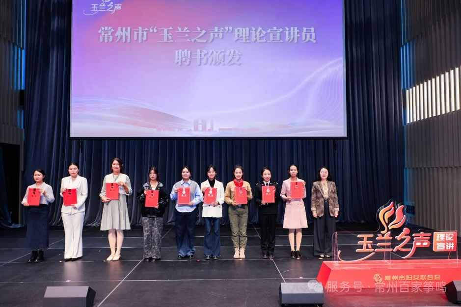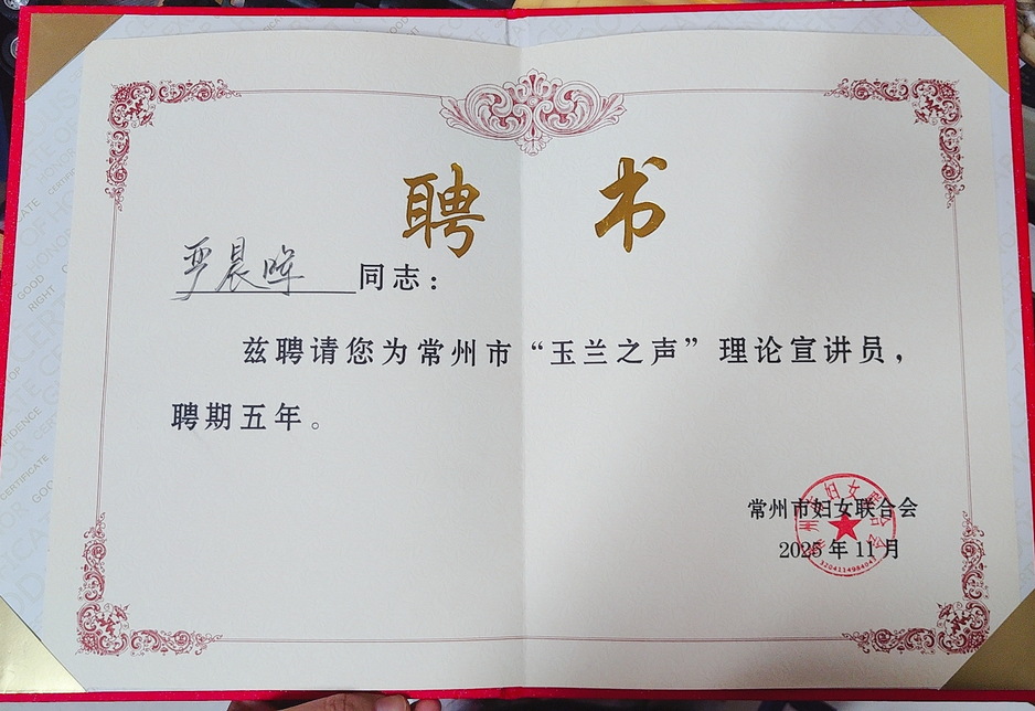 在活动聘任仪式上,常州市妇联挂职副主席丁莉为在训练营中脱颖而出的优秀宣讲员颁发聘书。我校妇联推荐的马克思主义学院教师严晨晖、刘欣怡凭借在训练营期间的优异表现,与其他七位学员一同受聘,正式成为常州市"玉兰之声"理论宣讲团成员。她们将随宣讲团深入基层一线,参与后续理论宣讲工作,让党的创新理论在旋律与故事中更好地融入人心、服务大众。